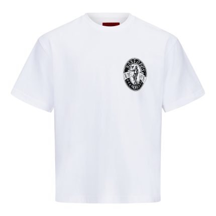 Ce T-shirt en coton blanc présente une encolure côtelée, un graphisme flou “statue” imprimé sur la poitrine et un dos