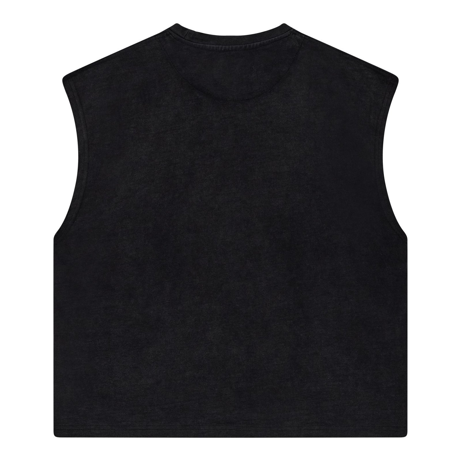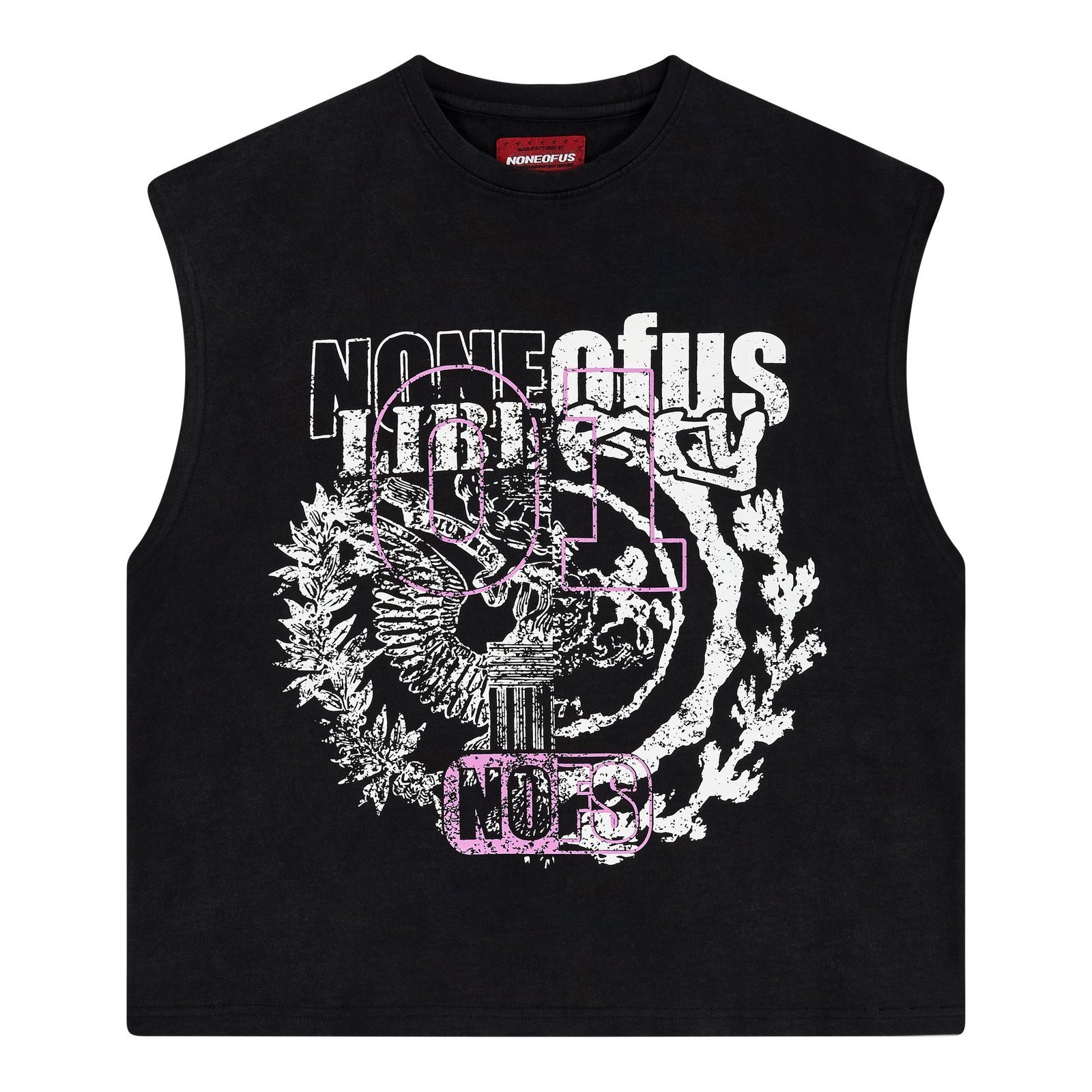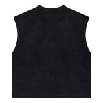 Custom vintage wash cotton  sleeve less shirt features a distressed ribbed neckline, with cracked „Liberty“ graphics printed at front and