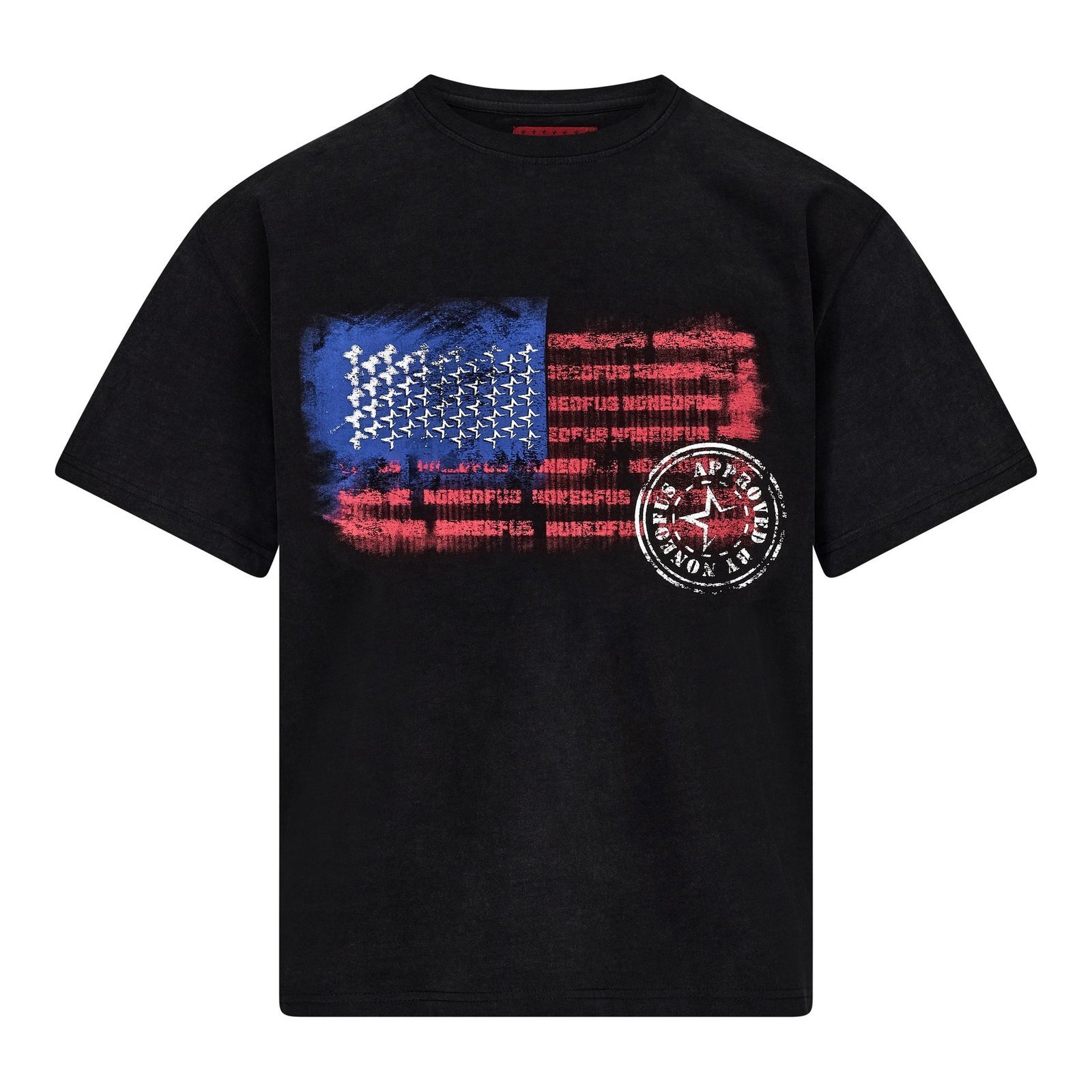 Ce t-shirt en coton lavé vintage personnalisé présente une encolure côtelée, des motifs “US” craquelés imprimés sur le devant et un dos propre.
